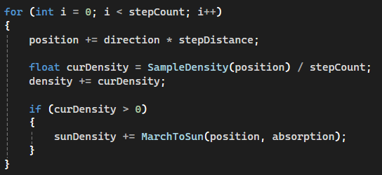 The last big step was calculating how the light behaved inside the clouds. The first thing I tried using was Beer-Lambert’s law for the attenuation of the light. After reading Guerilla Games presentation about their clouds and their beer-powder approximation, I implemented it, and thought it looked better than just Beer'-Lambert’s law.